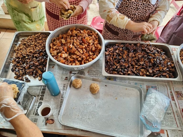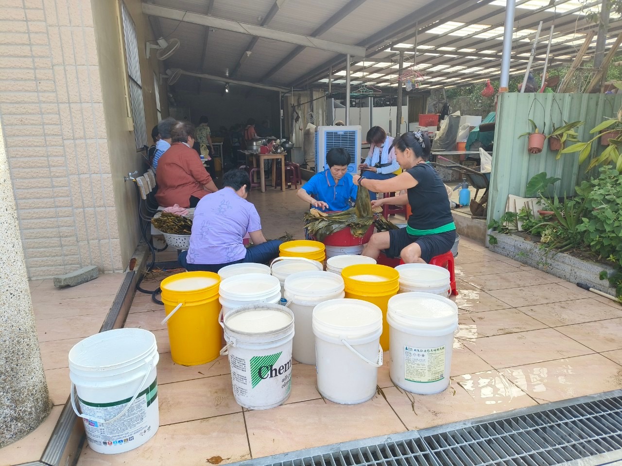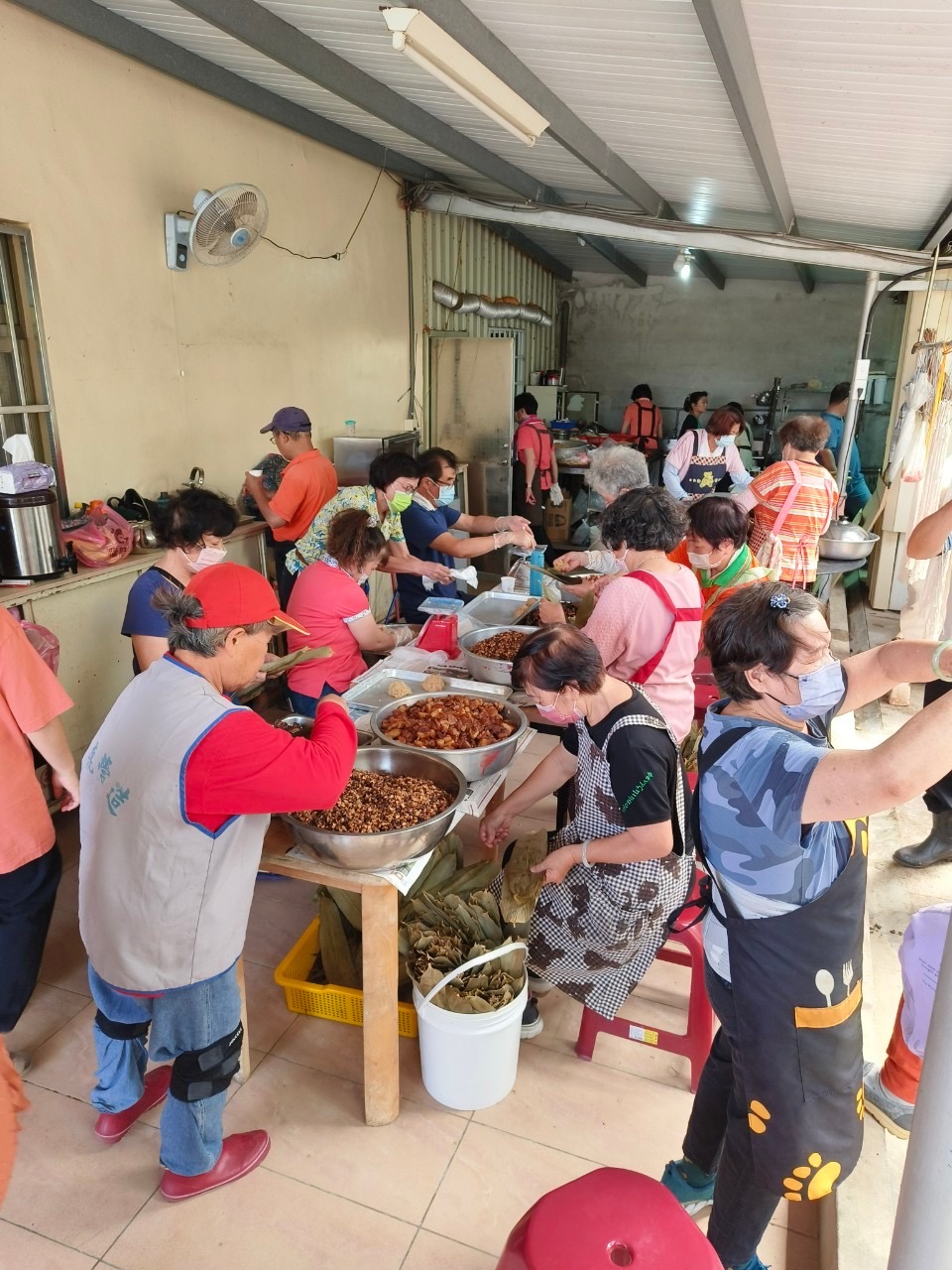 陸陸續續包粽志工們都到了,哇!今天真是熱鬧,屏東回來的鄧二姐,而彰化來了一車5位,台北也來了一車4位,連新城村村長夫妻都來幫忙,陳師姐帶領的大眾廟同修師姐,好些人都是第一次來參與這項活動。