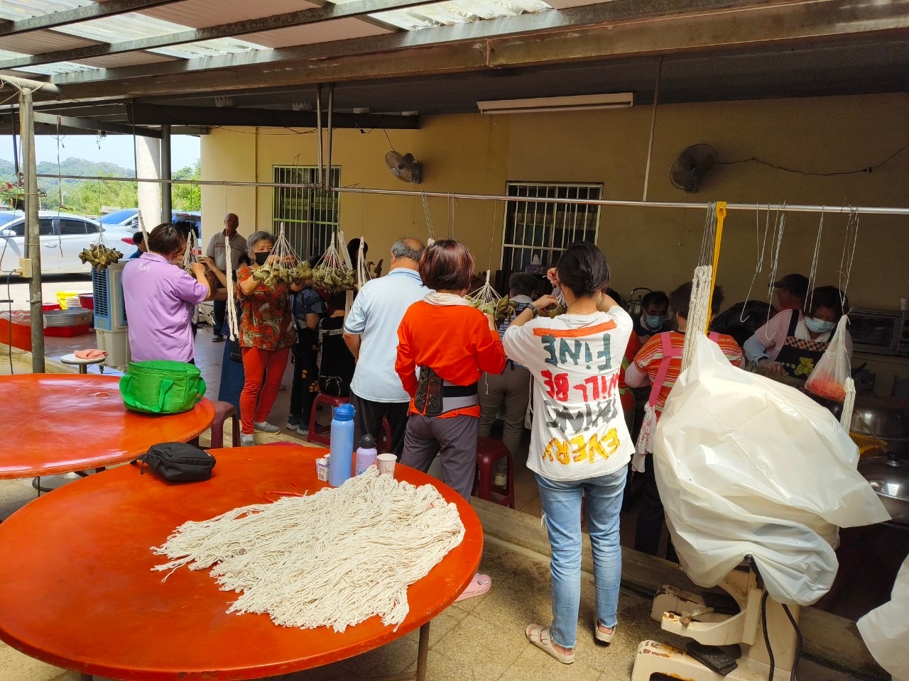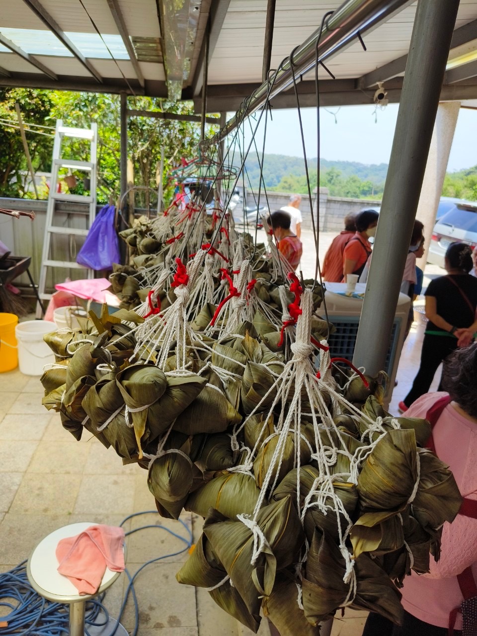 有師兄師姐是炒米炒餡高手,有師姐是包粽老手,也有人從來都沒機會學包粽,今天全部分組各就各位:在廚房炒米、炒餡的,洗粽葉的,揉米糰秤重的,折好粽葉裝餡的,包裝完成粽子形狀的,綁起來完成串的。啊喲!我們都很有緣又很有默契哦,居然下午四點多就完成任務,包好120串*20顆/串!今天大家還是跟往年一樣,準時下山回家啦!