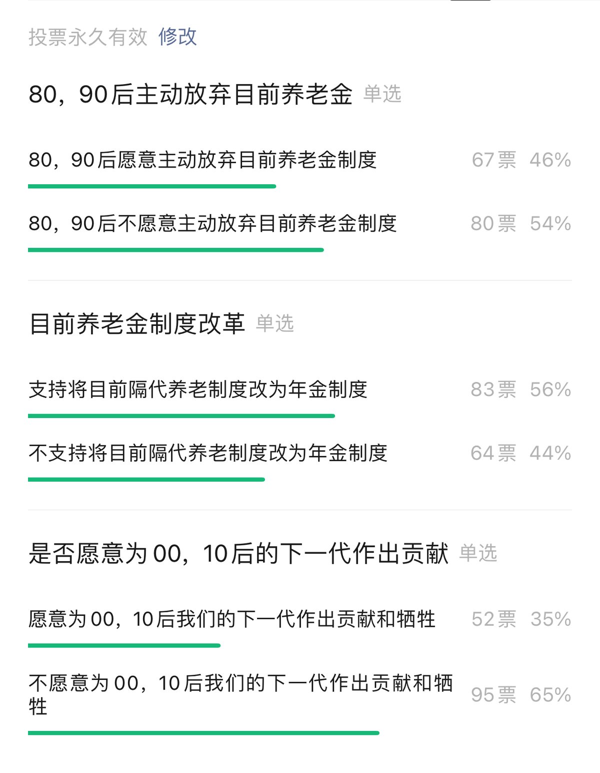 从目前的投票结果莱看,结果非常明显:作为目前养老金的最大受益者,50、60、70后他们当然不愿意进行改革,甚至也不愿意为00、10后作出贡献和牺牲;而80、90后处于一个矛盾的心理状态,一方面是自己的子女。他们希望自己的子女身上的担子不要那么大,愿意为他们放弃养老金的制度;另一方面他们又是矛盾的,担心自己以后退休之后的生活。所以80、90后同意放弃与不同意放弃目前养老金制度的比列基本趋同,但是不愿意放弃稍微占优;但是,认为养老金制度改革处于相对的优势地位。毕竟自己对自己未来负责的年金制度更加合理也更加符合个人利益;而在是否愿意为00、10后做贡献和牺牲的调查中,大多数都不愿意。