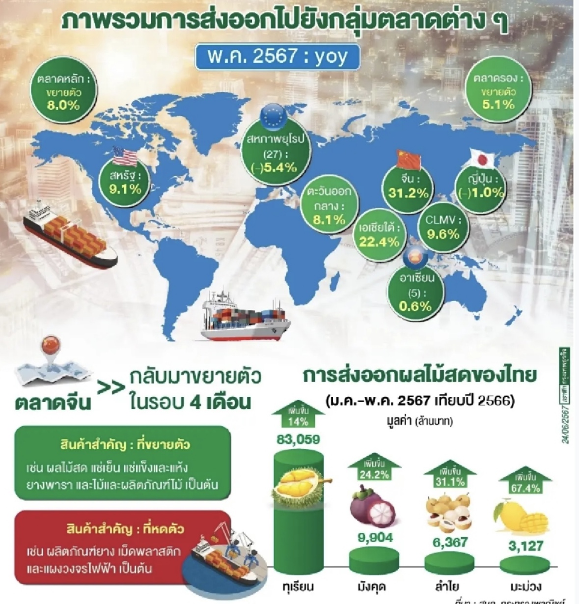 2024年初開始出口中國市場如此消極,可能有必要評估中國不再是出口的機會。隨著榴槤等新鮮水果進入中國市場,出口銷售出現反彈,因為榴槤出口總額為830億銖,而僅僅4月出口到中國市場的價值就高達500億銖,在評估支撐中國經濟的六大因素後,泰國應該足以擴大整體和未來的出口機會。(泰國世界日報)