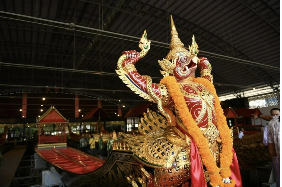 據悉,10月27日正日的鑾駕布施儀式,將有52艘船在湄南河上組成龐大方隊,分為5個組,覆蓋河面長1200米,寬90米的水域。主船為「金鳳船」,長44.9米,寬3.14米,船上有50名划手和兩名舵手。副船「那羅延納神乘金翅鳥船」,長44.3米,寬3.2米,船上有50名划手和兩名舵手。第二副船「毗濕奴神乘龍船」,即「七首神龍」長42.95米,寬2.95米,船上有54名划手和兩名舵手。