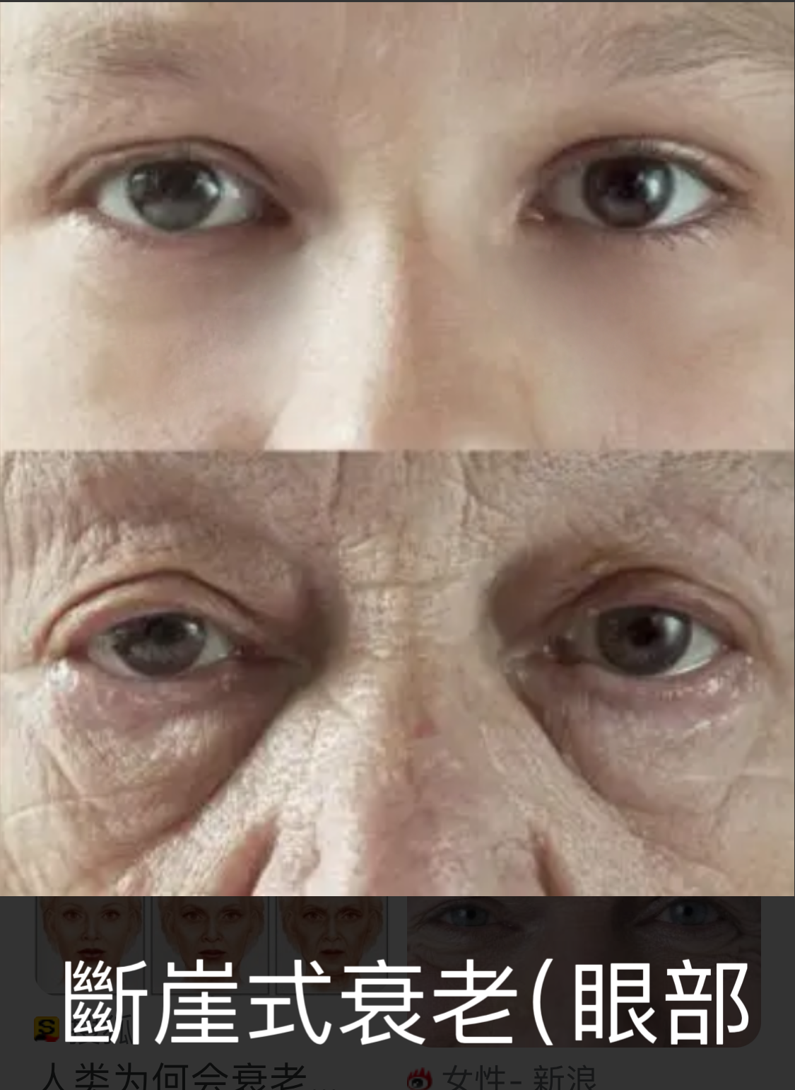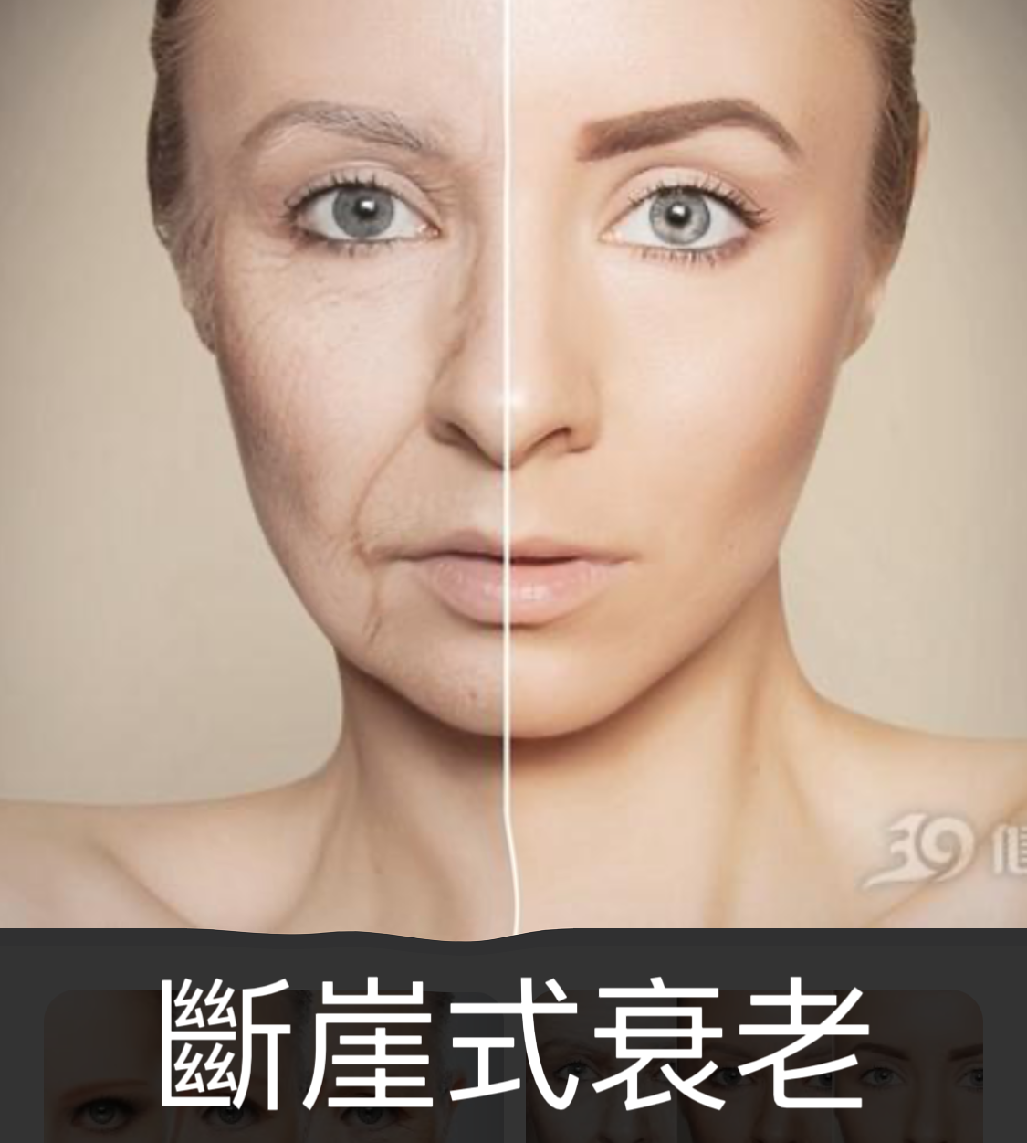 是指皮膚的衰老並不是勻速線性發生,而是在某一時間段突然加速衰老。原因是人到了18歲之後,每年會以1%的速度,膠原蛋白會慢慢地跟著下降,但到了30歲後,就已經減少了10%,初老就是這麼來的! 一旦到了45歲至55歲之間,膠原蛋白會急速地下降,這就是斷崖式衰老的由來!有研究報告發現,人體內和衰老相關的基因蛋白分別在34歲、60歲、78歲大幅減少,導致出現「三段斷崖式衰老」。當中,34歲的突然衰老在「顏值」上體現得最為明顯,面部肌肉開始塌陷、膠原蛋白大量流失,面型輪廓變得模糊、皮膚失去年輕時的飽滿彈性與光澤感。