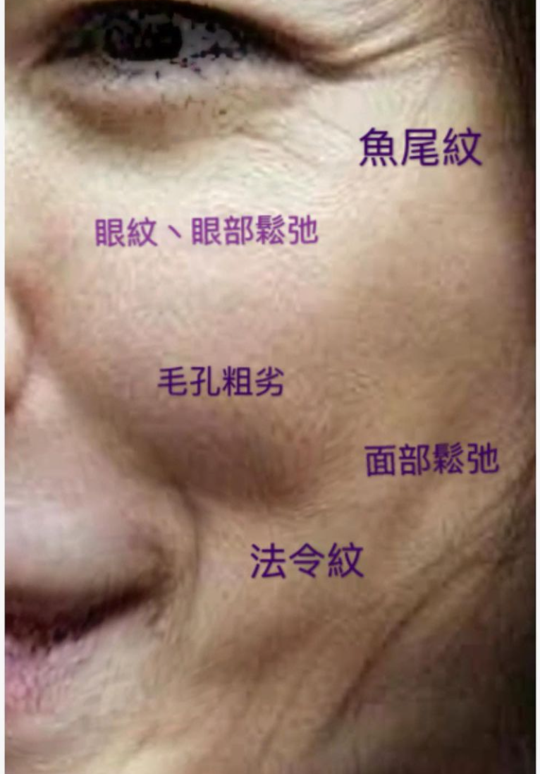 肌膚缺乏彈性、臉容浮腫、輪廓凹陷、蘋果肌下垂、法令紋加深、眼尾下垂