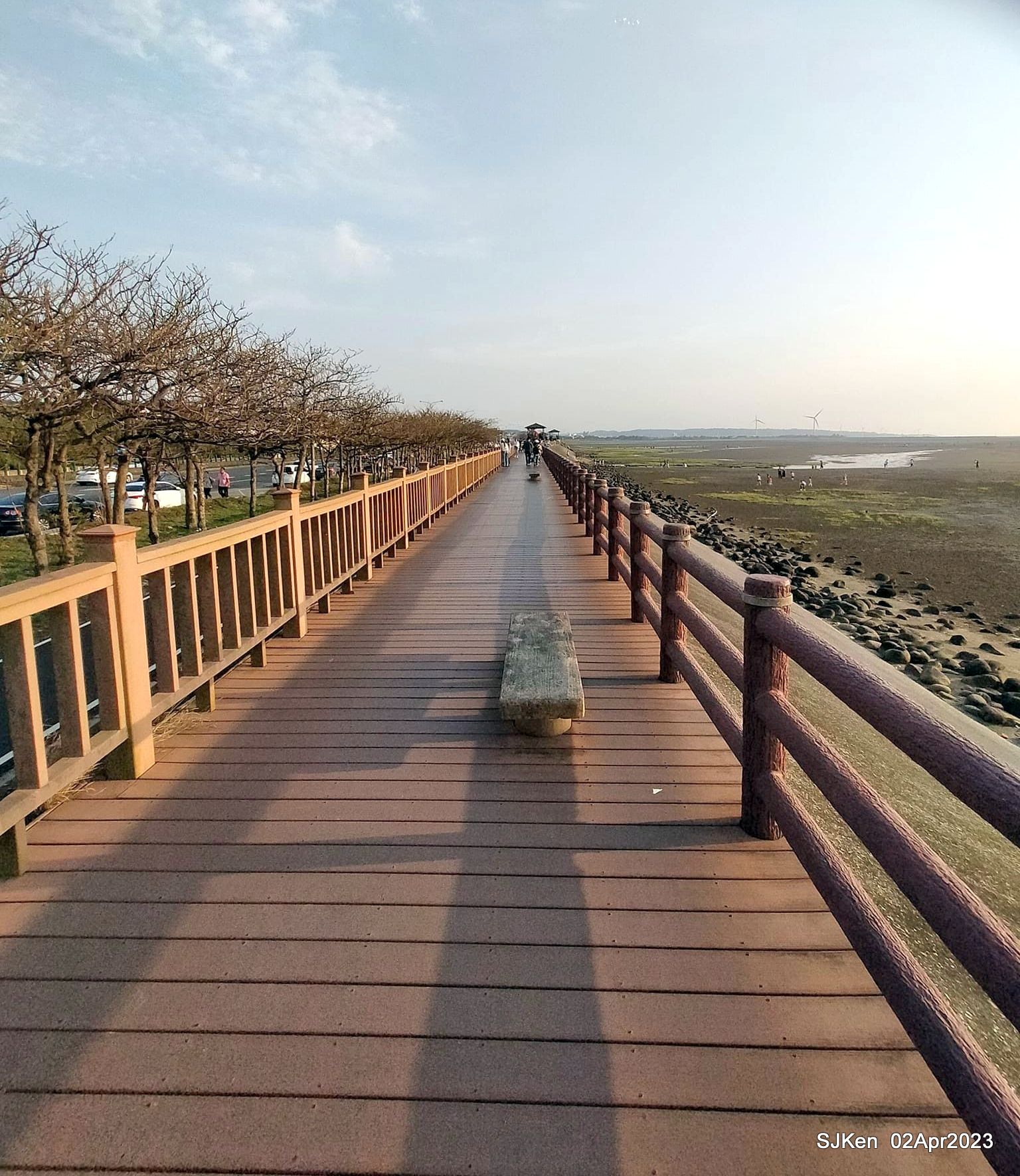官網上介紹退潮時「萬蟹奔騰」景象是自然的奇景十分壯觀, 不過去年4月傍晚造訪時,可能是季節不對,卻是只勉強看到一兩隻脫殼的螃蟹,但就算看不到「萬蟹奔騰」的奇景,在廣袤的步道上,可以一覽天水合一的天際雲景, 還可遠眺巨大的風力發電風車輪。