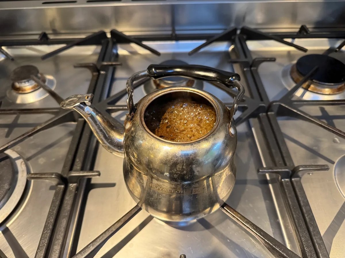 • 最後一次加熱茶水,水滾後立即用不鏽鋼茶隔將茶倒入另一壺,過濾茶葉。