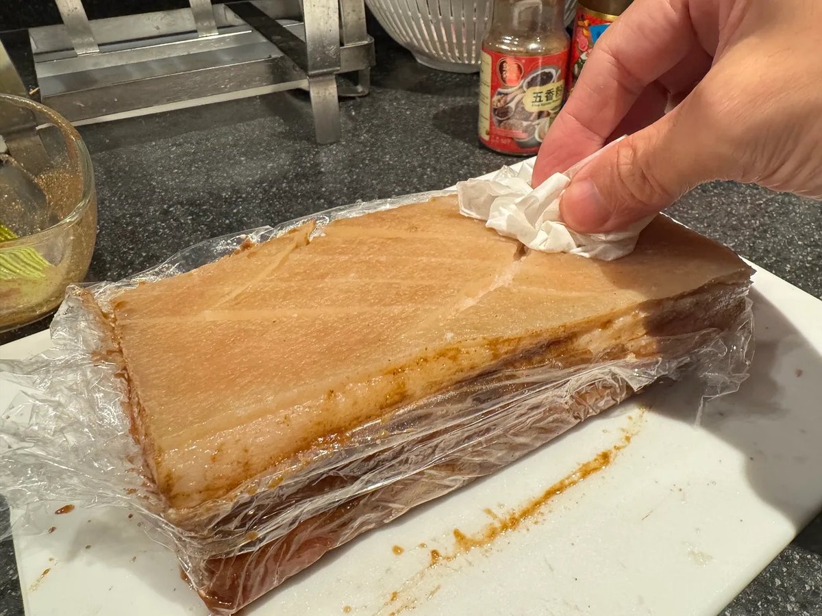 • 放入雪櫃冷藏兩天風乾,抽乾豬皮水份之餘,更可讓豬腩充分入味。