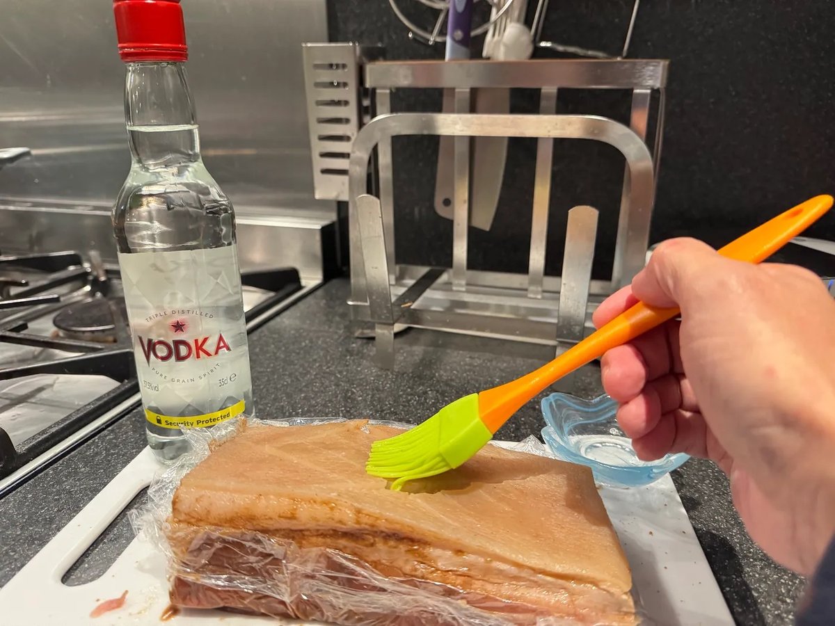 • 在豬皮表面塗上伏特加酒並灑上粗鹽,幫助吸乾水分。