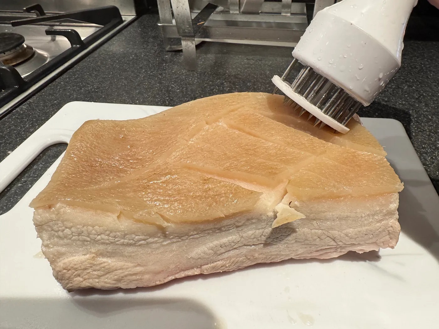 • 用鬆針刀或數支竹籤在豬皮上來回插洞約4分鐘(只需插至豬皮深度,不用過深),確保烘烤時豬皮能均勻爆開。