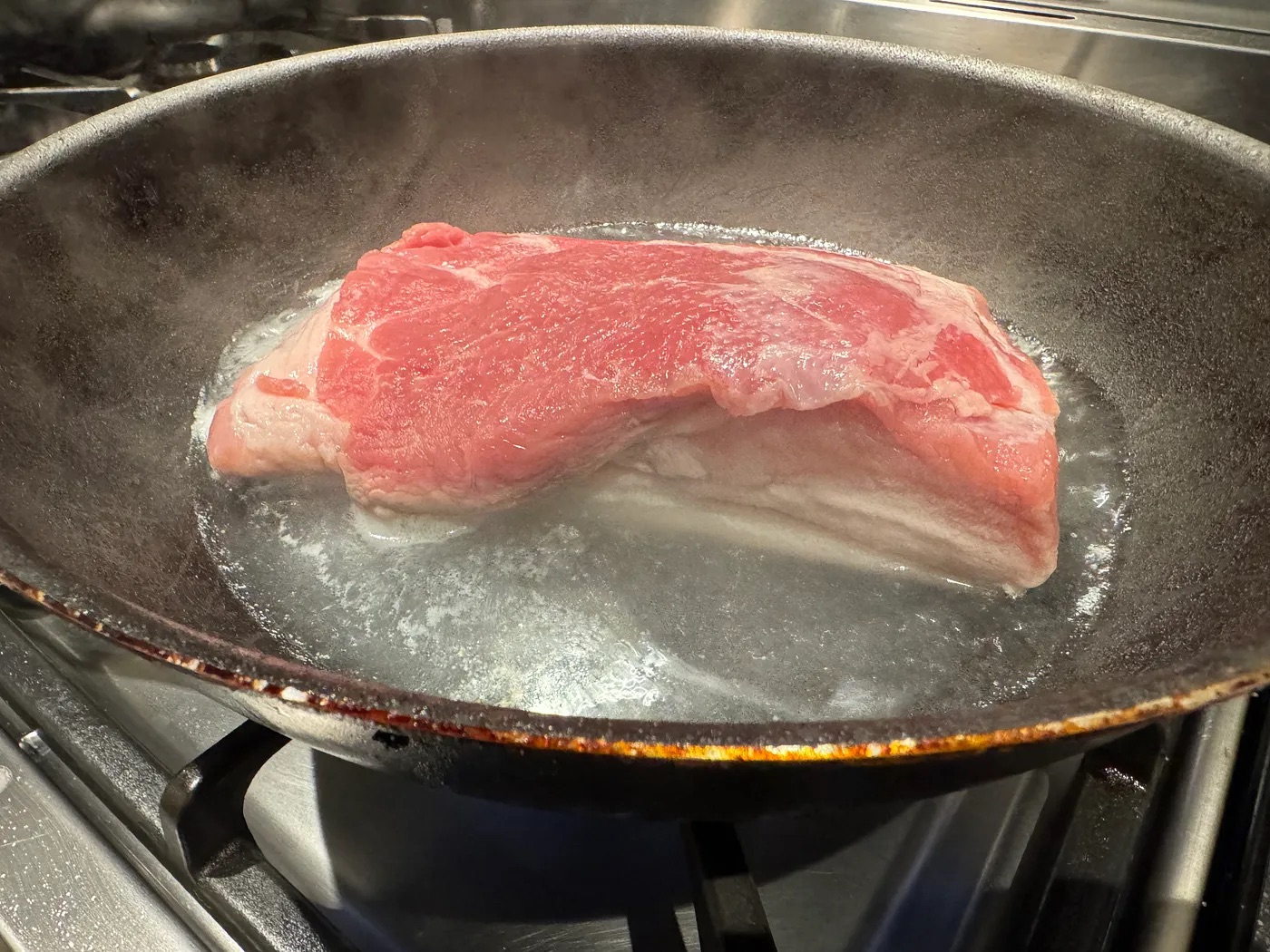 • 先將豬腩肉洗淨,把豬皮面朝下放入鍋中,加入熱水煮10分鐘,水位僅覆蓋豬皮。