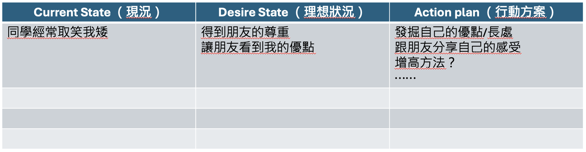 父母甚至可以主動找子女討論,大家不妨跟子女做一個差距分析的練習Gap analysis,一起發掘子女想達成的目標,以上述技巧,制定可行的方案,協助子女達成他們渴望的理想的狀況(desire state)。