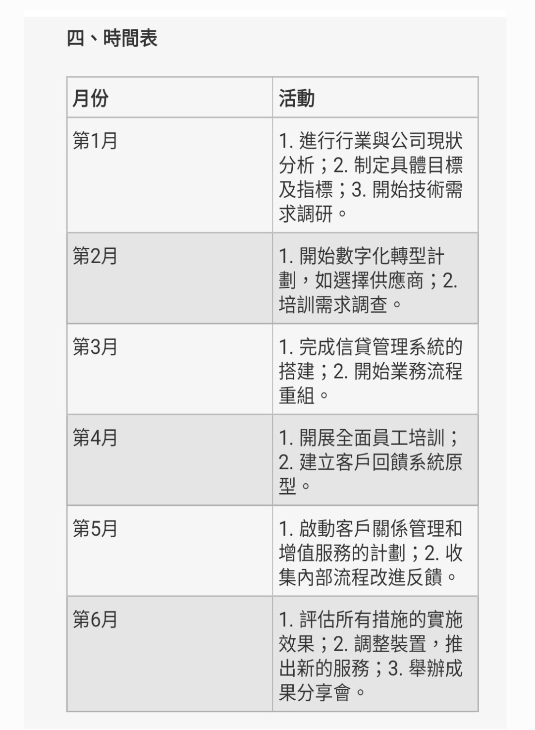 信貸行業流轉量驚人,作為行業持份者提升信貸行業公司的管理計劃書,目標在六個月內提高運營效率、服務質量和客戶滿意度。以下是一個詳細的計劃書架構,包括各項措施和時間表。