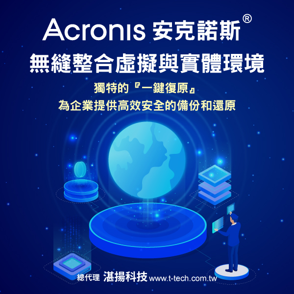 Acronis台灣總代理湛揚科技,深耕台灣市場已逾10年,憑藉專業技術團隊,為企業提供從售前規劃到售後支援的完整解決方案。湛揚科技協助MSP透過ACPC平台進行集中管理,資料保護、網路安全和端點管理的整合式服務,同時也為買斷制Acronis Cyber Backup的客戶提供穩定、可靠且全面的資料保護方案。今年2025是資料安全年,安克諾斯總代理湛揚科技年後將推出全新『有地有雲』方案,為企業打造極致資料備份與復原的體驗。歡迎上網申請30天免費試用服務,更多產品資訊請洽湛揚科技02-2515-1585或官網https://www.t-tech.com.tw 留言,我們將派專人與您聯絡。