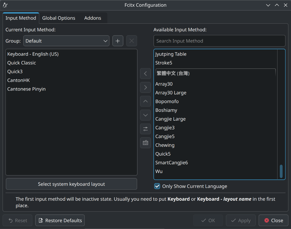 輸入法選取Fcitx5,確認後關閉視窗,然後重開機。