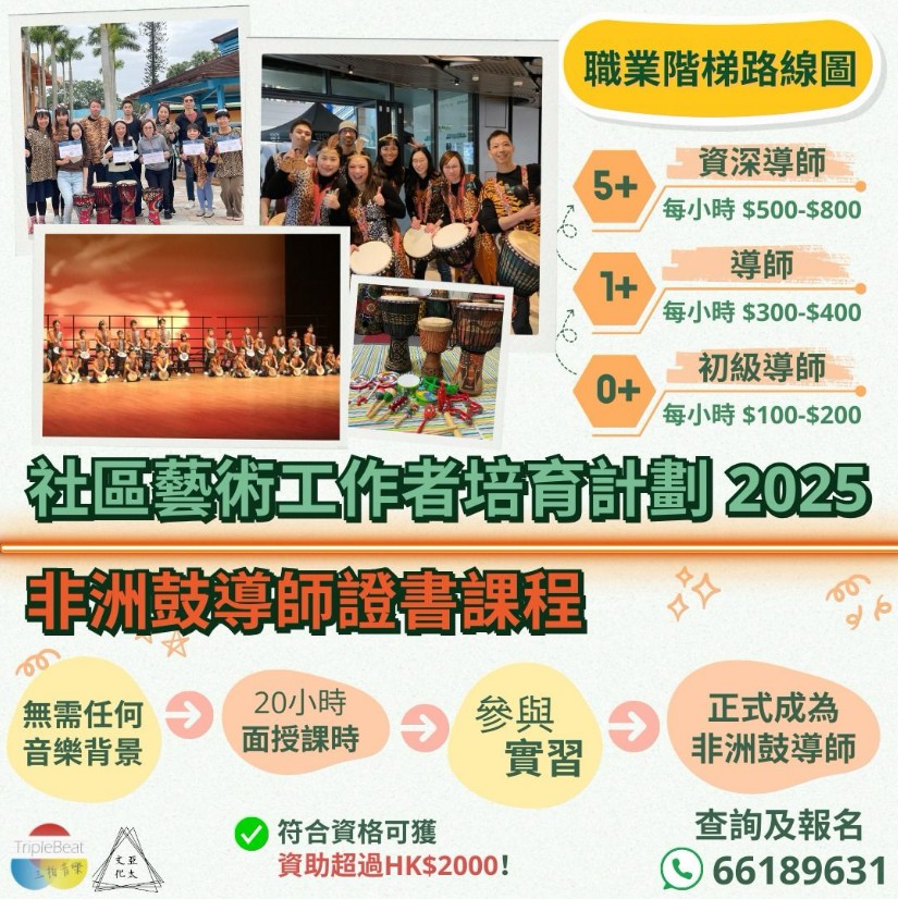 由於我的專長是教學,就以成為導師為例,現時除了教私人語言興趣班及到社區中心當課餘託管班導師之外,我報讀了非洲鼓導師證書班,這是三拍音樂舉辦的社區藝術工作者培育計劃,學員在完成20小時的課程及10小時的實習後,可有機會獲取錄成為非洲鼓導師。這個社區藝術工作者培育計劃為符合資格的自由工作者提供資助,入讀條件不需任何音樂背景,並且給予了明確的職業導向階梯。個人認為當非洲鼓導師工資也算很不錯,零經驗的初級導師可獲時薪$100至$200,一年經驗的導師則可獲時薪$300至$400,5年經驗的導師則可獲時薪$500至$800左右,都不失為一條出路。