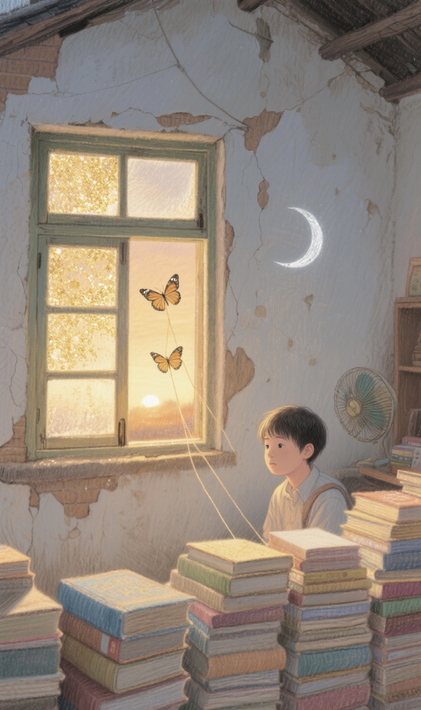 窗是小屋的眼睛。清晨,它睜開眼接住第一縷陽光,讓金粉簌簌落在剝落的牆皮上;黃昏時又淌進滿屋暮色,把牆角的灰塵都染成蜂蜜色。我蜷在這方天地裡,哼著跑調的歌,以為聲音能化作蝴蝶飛出窗外,卻不知在別人耳中,不過是擾人的雜音,像風箏掙脫線時無力的顫抖。那些自以為是的浪漫,原來只是世界頻率之外的異響。