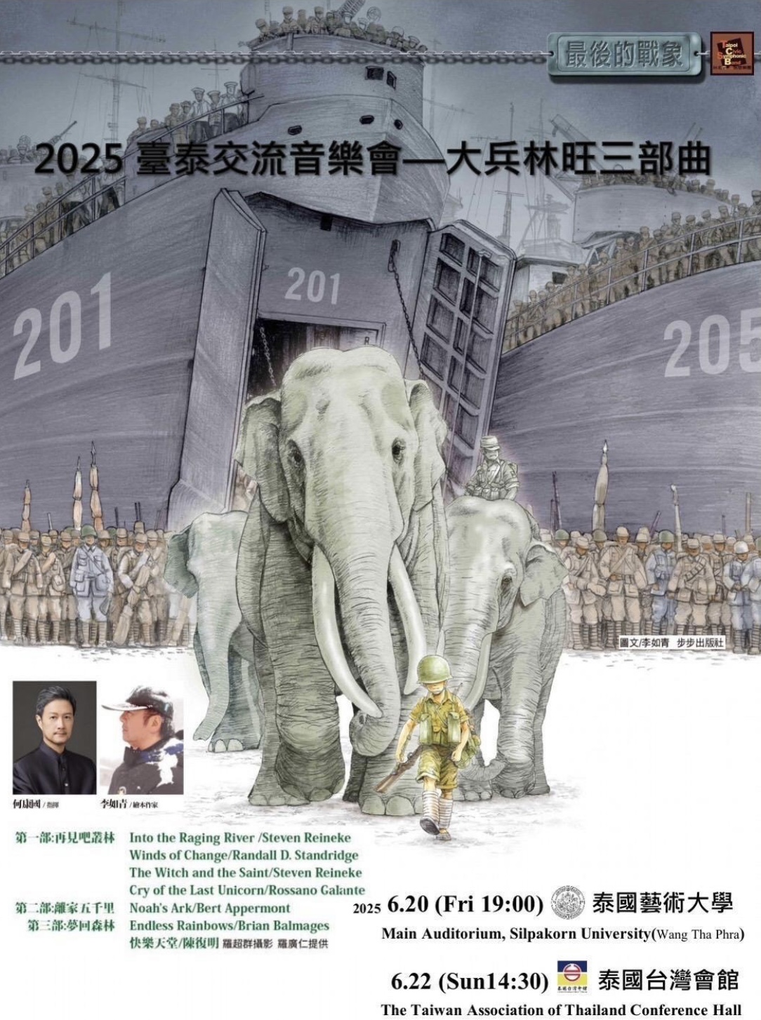 【泰國新聞報導】「2025台泰交流音樂會—大兵林旺三部曲」發想自金鼎獎作家李如青的同名繪本,與台北市民管樂團合作,將於2025年6月20日、6月22日分別在泰國藝術大學及泰國台灣會館演出。