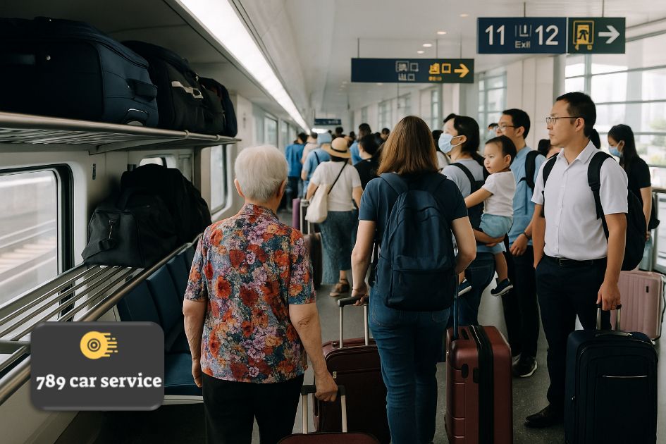 高鐵乘客排隊過關與行李放置於公共行李架,顯示公共交通方式的實際使用情況