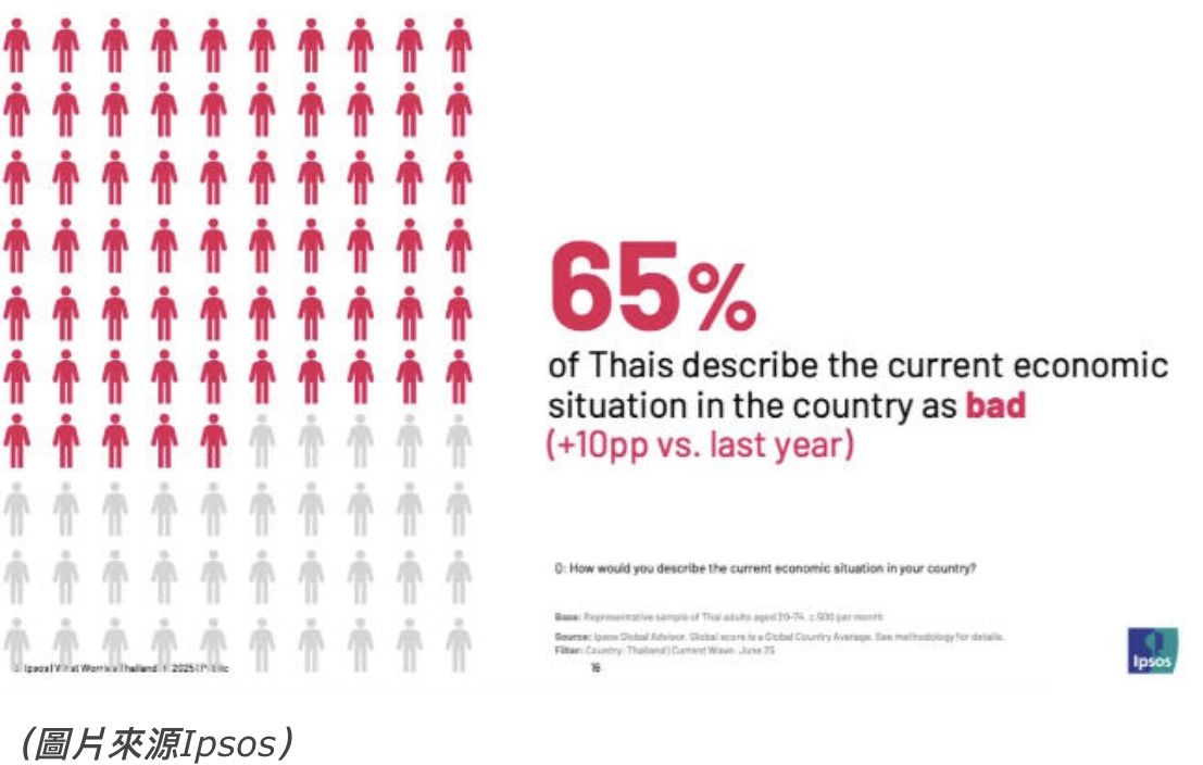 Ipsos調查發現,66%泰國民眾認為社會已陷入危機狀態,60%認為國家經濟正處於衰退週期。這種悲觀情緒顯著影響消費行為,65%受訪者認為當前經濟形勢較去年惡化(同比上升10%),53%對購置房產車輛等大額消費感到不安(同比增加6%),46%甚至對日常家居用品採購產生顧慮(同比激增10%)。