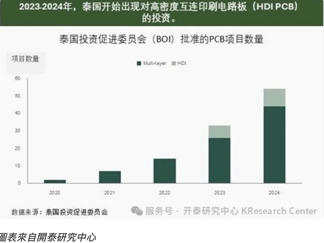 然而,自2023年起,泰國開始吸引高密度互連印刷電路板(HDI PCB)的投資項目,HDI PCB主要用於智能手機、衛星等小型高精密設備。截至目前,相關投資項目累計超過10個。