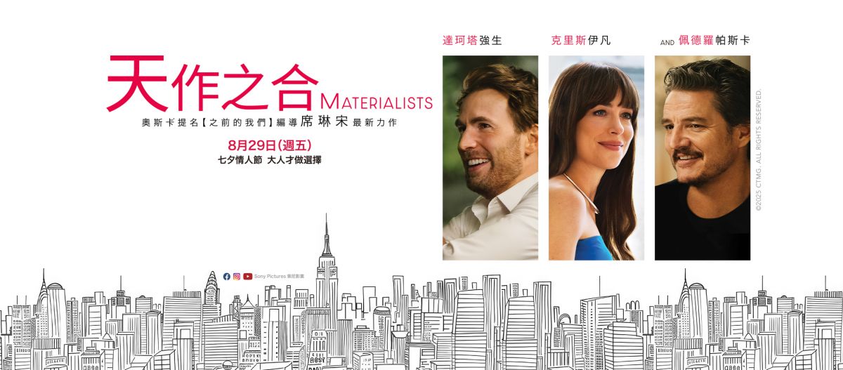 明天(2025年8月29日)七夕情人節在台上映最動人的愛情喜劇《天作之合》(Materialists),是由以《之前的我們》獲得奧斯卡最佳影片&最佳原創劇本雙提名的加拿大韓裔導演席琳 · 宋(Celine Song)一手編導,《格雷的五十道陰影》系列達珂塔·強生(Dakota Johnson)、《美國隊長》系列克里斯·伊凡(Christopher Evans)與《驚奇4超人:第一步》佩德羅·帕斯卡(Jose Pedro Balmaceda Pascal)領銜主演,故事靈感源自於編導席琳 · 宋(Celine Song)之前當過戀愛顧問(Love Matchmaker)的個人經驗,該片由A24定檔2025年6月13日在美國院線上映,索尼影視娛樂國際公司負責國際發行。