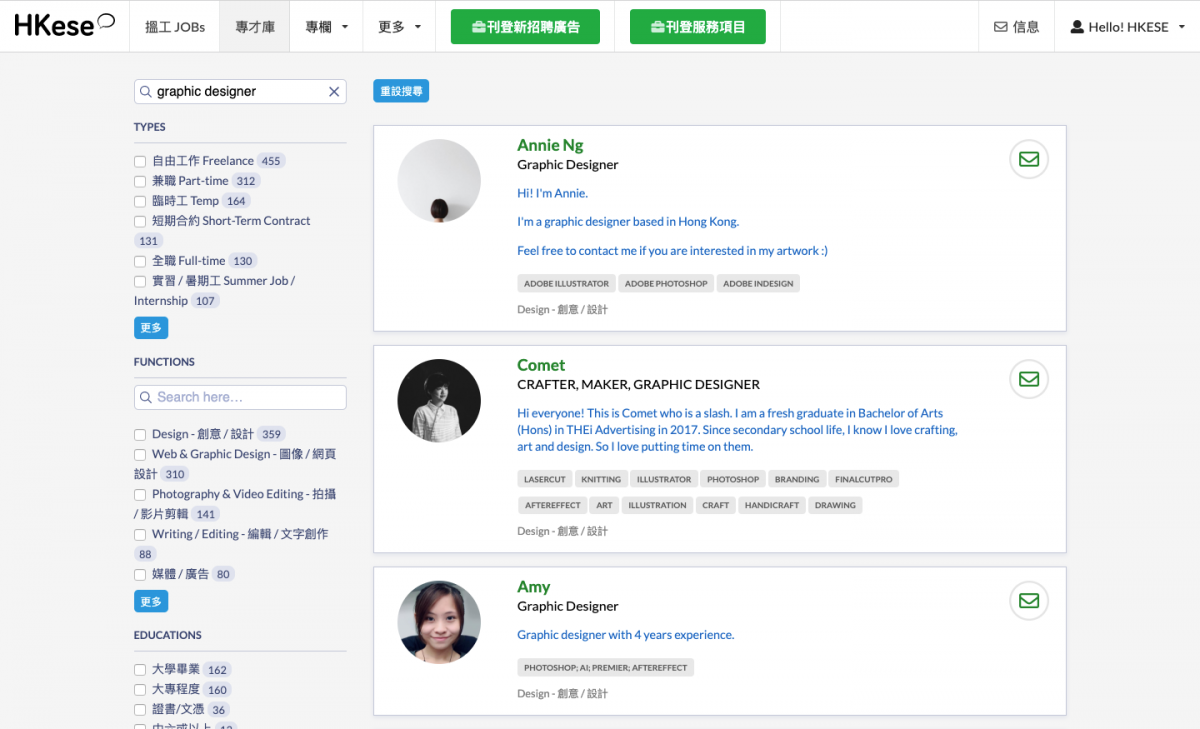 在專才庫中,你可以直接看到專才的個人檔案,包括自我簡介、資歷及作品集(Portfolios)。僱主們無需再花時間逐一下載求職者的履歷表,再慢慢進行比對,節省更多時間。