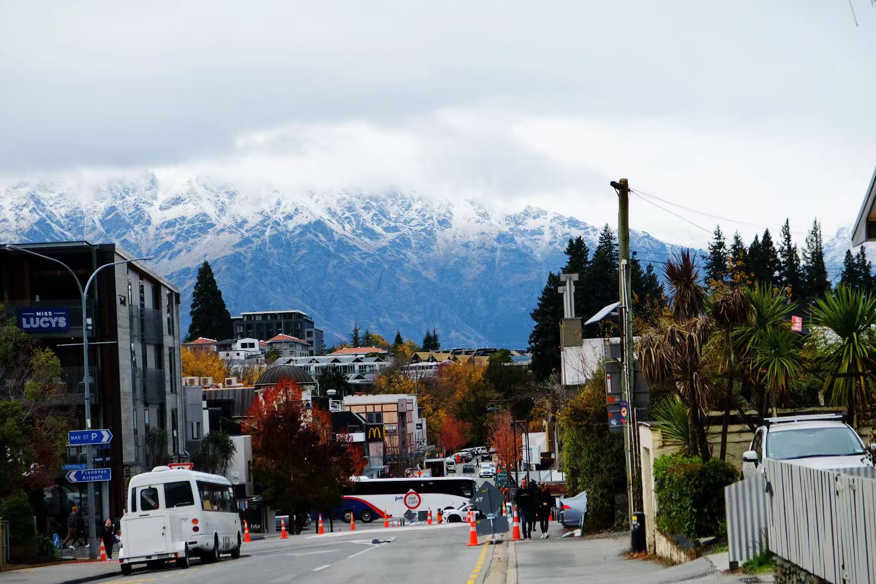 剛踏進皇后鎮,那股乾淨的冷風撲面而來,帶著點兒微微的寒意。天空特別藍,陽光穿過稀薄的雲層,照在遠處的雪山上和湖面上,閃閃發亮。鎮上街道鋪著金黃的落葉,樹葉從夏天的翠綠變成了暖色調,好像給整個小鎮穿上了秋冬的外衣。走在湖邊,湖水靜得像鏡子,映出遠方雪峰的輪廓,風景靜謐又壯美。