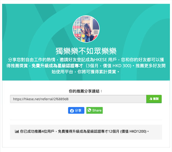 現在,只要透過連結邀請好友成功登錄成為HKESE 專才用戶,您和你的好友即可同時獲得推薦獎賞 - 免費升級成為星級認證專才(3個月,價值 HKD 300)