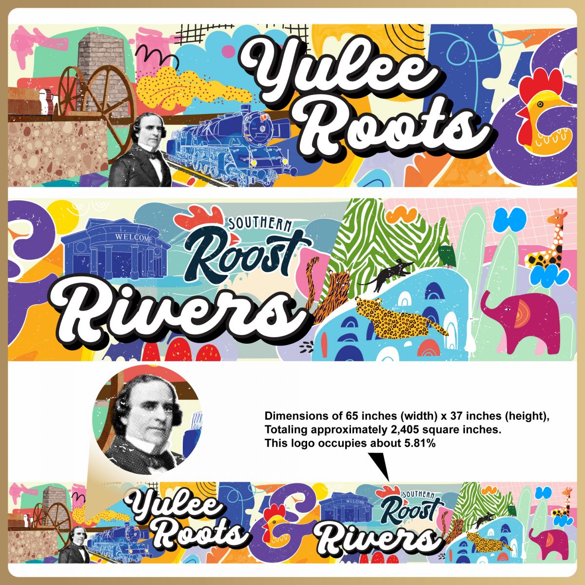 I created a new mural concept, titled "Yulee Roots & Rivers," that integrates Yulee's nature, history, and community, fitting the Southern-inspired style of Southern Roost's chicken. Emphasizing "deeply rooted community," the design unfolds from left to right (77" high x 538" wide), with a cream-white background and red branding accents. The logo is small in the lower right corner (<24 sq ft).