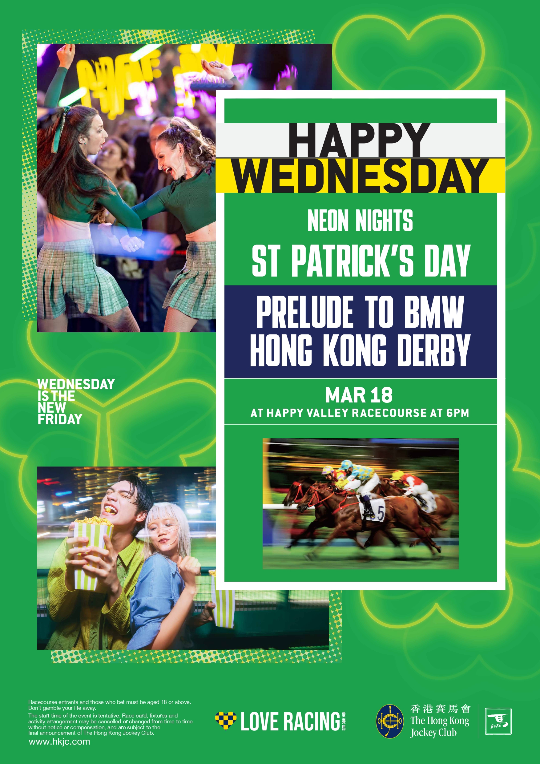 3月18日,Happy Wednesday迎來雙重興奮:馬季矚目賽事「寶馬香港打吡大賽」的最終倒數與聖派翠克節(St. Patrick’s Day)。The Young Bucks送上活力輕快的愛爾蘭傳統旋律,現場供應一系列美味的傳統愛爾蘭佳餚以及健力士黑啤。誠邀各位以綠色造型出席,為這場四歲馬經典賽事系列的終極對決作好準備!
