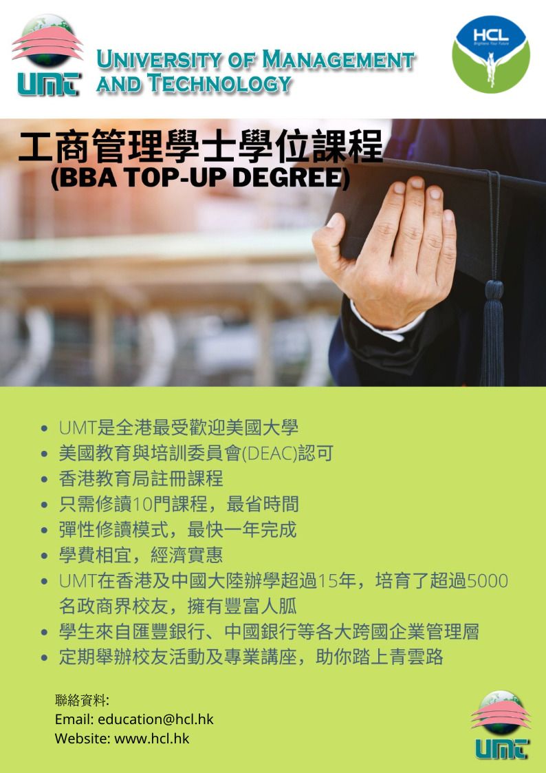 美國管理科技大學University of Management and Technology( UMT )是一所工程管理,工商管理學士課程 (BBA) 及其他專業證書培訓課程而聞名的研究型大學.同時是全港最受歡迎的美國大學.