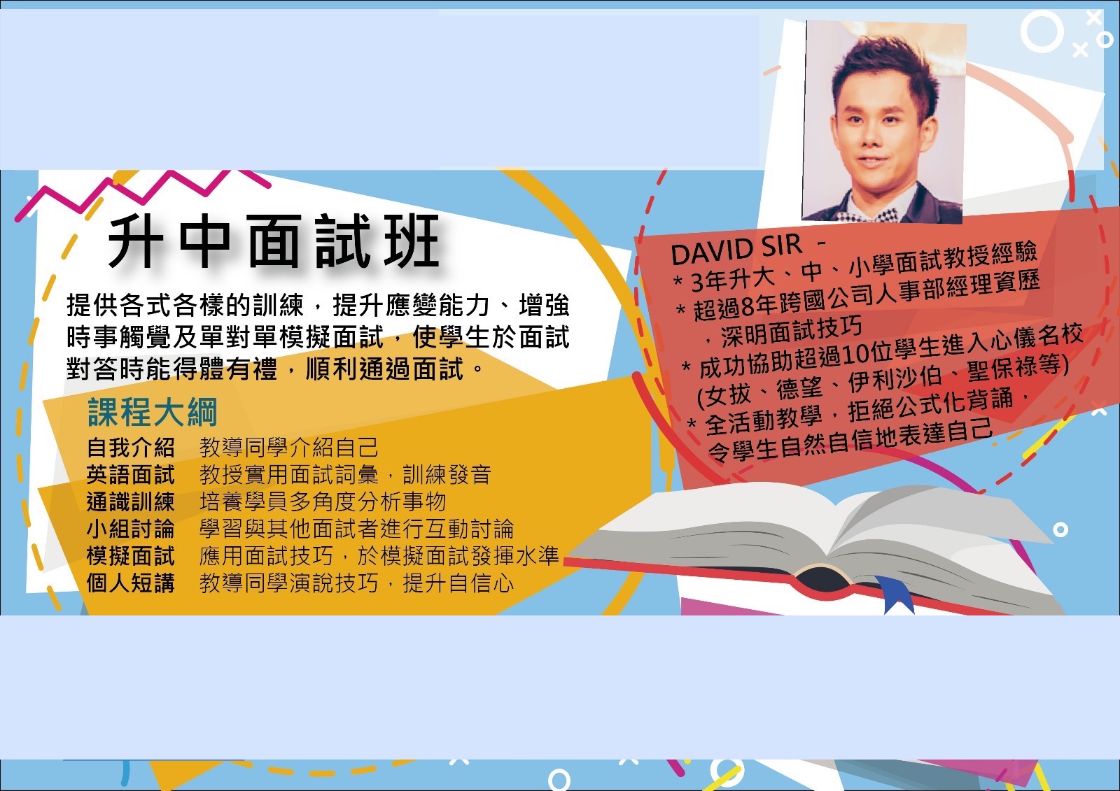 我系David Sir! 我会以多年专业升中升小一面试班经验,协助你子女成功入读心仪学校之余亦为未来人生建立自信!