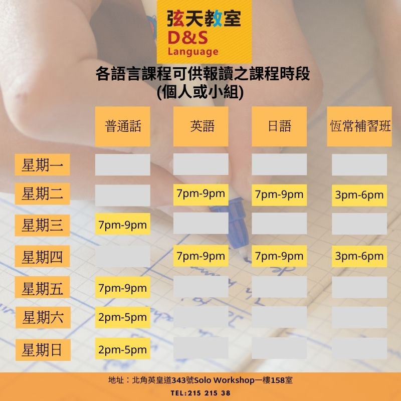 弦天教室提供恆常補習班及普通話/英語/日語課程