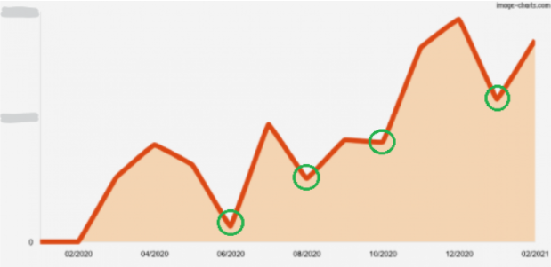 The MOM Revenue Chart shows the revenue improvement. In the 2nd chart, you can see the monthly revenue still increases in months even with no ads are placed (circled in green), this is due to the increasing no. of repeat customers who buy Kibble each month (acquired from the previous month). And all these happened without increasing marketing budget in months where ads were placed. Client is now able to invest more in marketing as revenue from recurring customer is accumulating more and more.