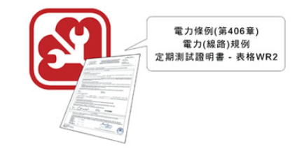 根據《電力(線路)規例》的規定,電力裝置擁有人須為其電力裝置安排定期檢查、測試及領取證明書。違法者不但會被檢控,更有可能引致火災及電力故障,對大眾安全構成危險。一般住宅或商業處所內的固定電力裝置,若其允許負載量超逾100安培,該裝置必須每5年最少接受一次檢查、測試及領取證明書。定期測試證明書(表格WR2)須遞交至機電工程署加簽。請注意,電力工程(包括檢查、保養、維修等)必須由註冊電業承辦商進行。