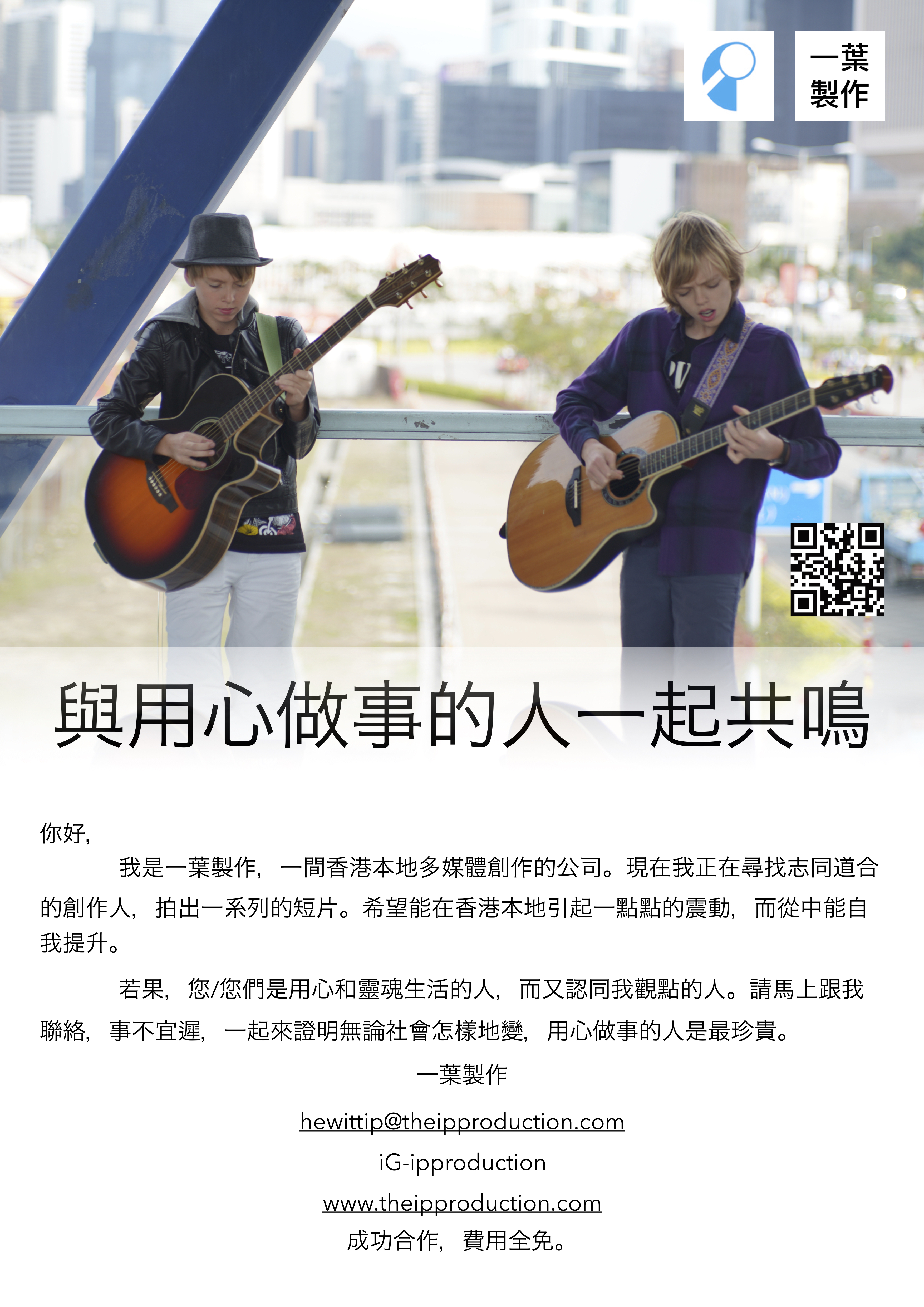 我是一葉製作,一間香港本地多媒體創作的公司。現在我正在尋找志同道合的創作人,拍出一系列的短片。希望能在香港本地引起一點點的震動,而從中能自我提升。