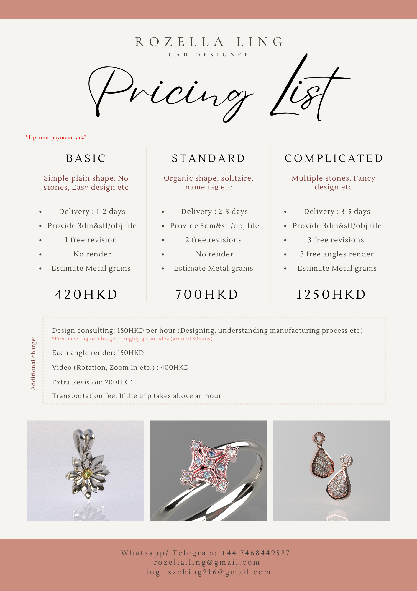 Hello! 我是 Rozella,感謝您查看我的Profile. 我是一名 CAD / 珠寶設計師,具有工廠生產經驗。