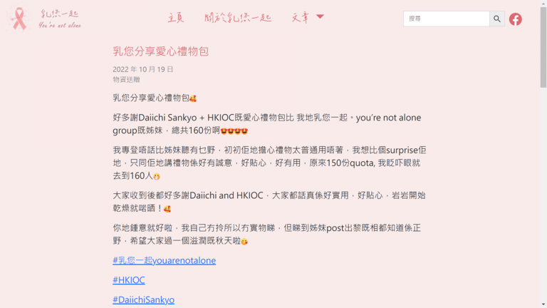 隨著群組日益成長,「乳您一起」Facebook專頁的文章也日益增加,Jacqueline發覺同路人很難找到過去一些發佈到專頁的有用資訊,因此Jacqueline萌生出為「乳您一起」製作網站的想法,希望能夠把文章作分類,讓姊妹們能夠很有系統地找到有用的資訊,例如不同類型乳癌的治療資訊,化療的資訊,飲食注意事項以及姊妹抗癌成功的感受(畢業文)等。