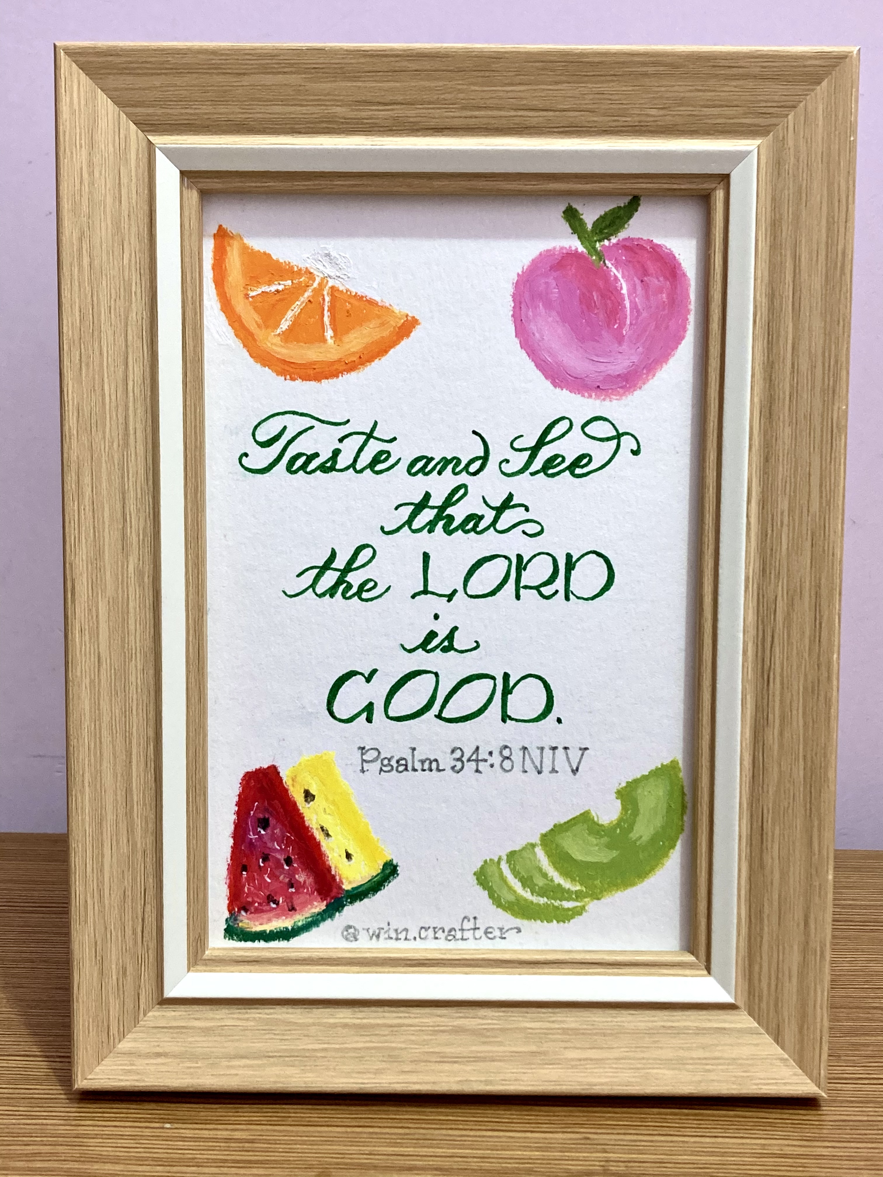 以西洋書法專用的 Brush Pen 書寫聖經金句,配上以油粉彩、木顏色、水彩筆等工具手繪的相關圖畫,木框鑲嵌,無論是放在家裡,還是送給信主的親朋摯愛,都十分🈴️適!