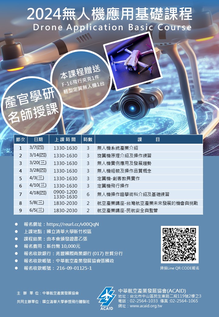 報名費用:新台幣10,000元(包含學費、F-16飛行夾克1件、輕型定翼無人機1台、課程結業證書業1張)