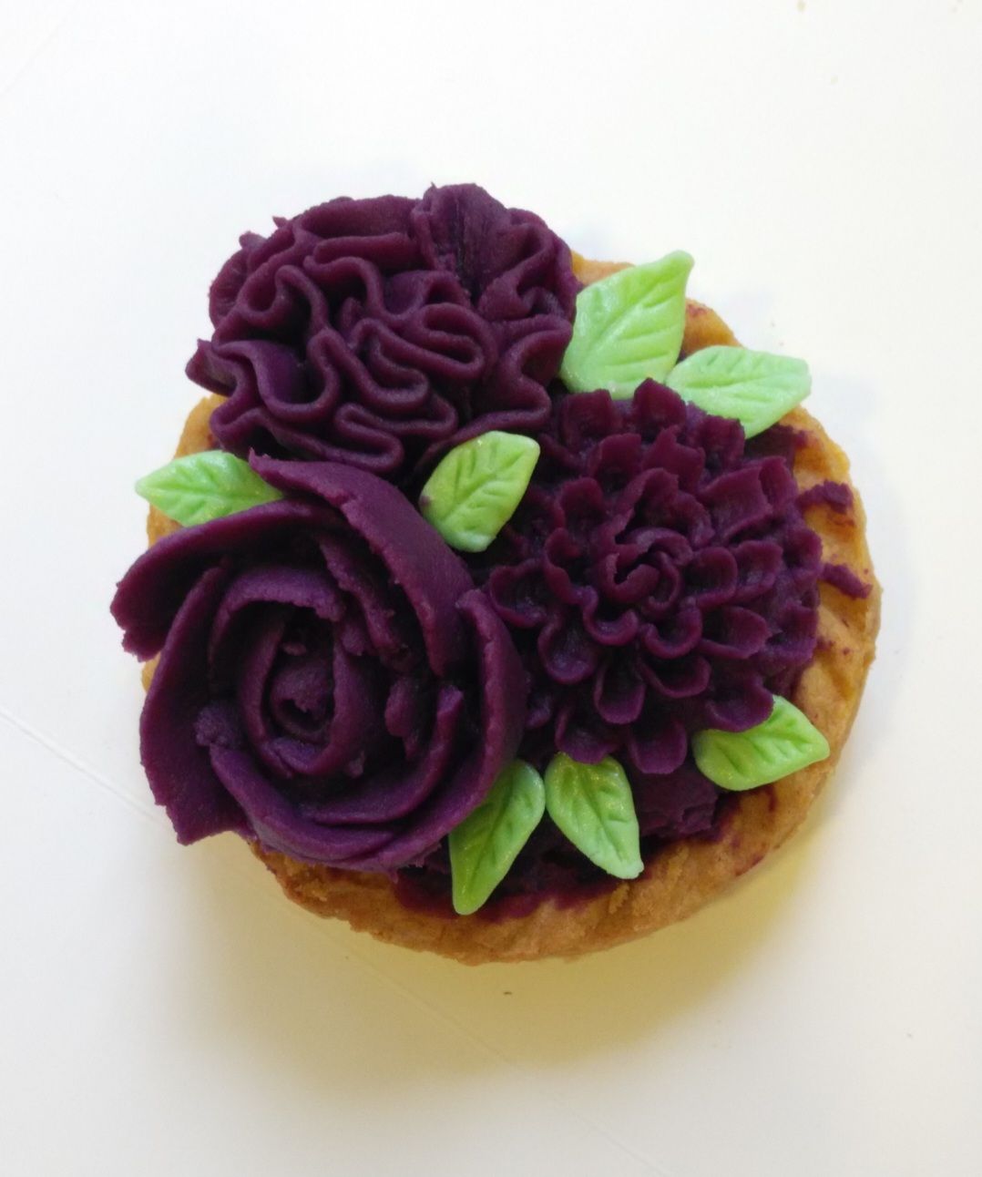 這是裱花紫薯撻,用紫薯和用唧咀唧出不同款式的花朵,有玫瑰花、康乃馨和菊花,再把綠色翻糖捏造出葉子形狀,放在撻皮上。