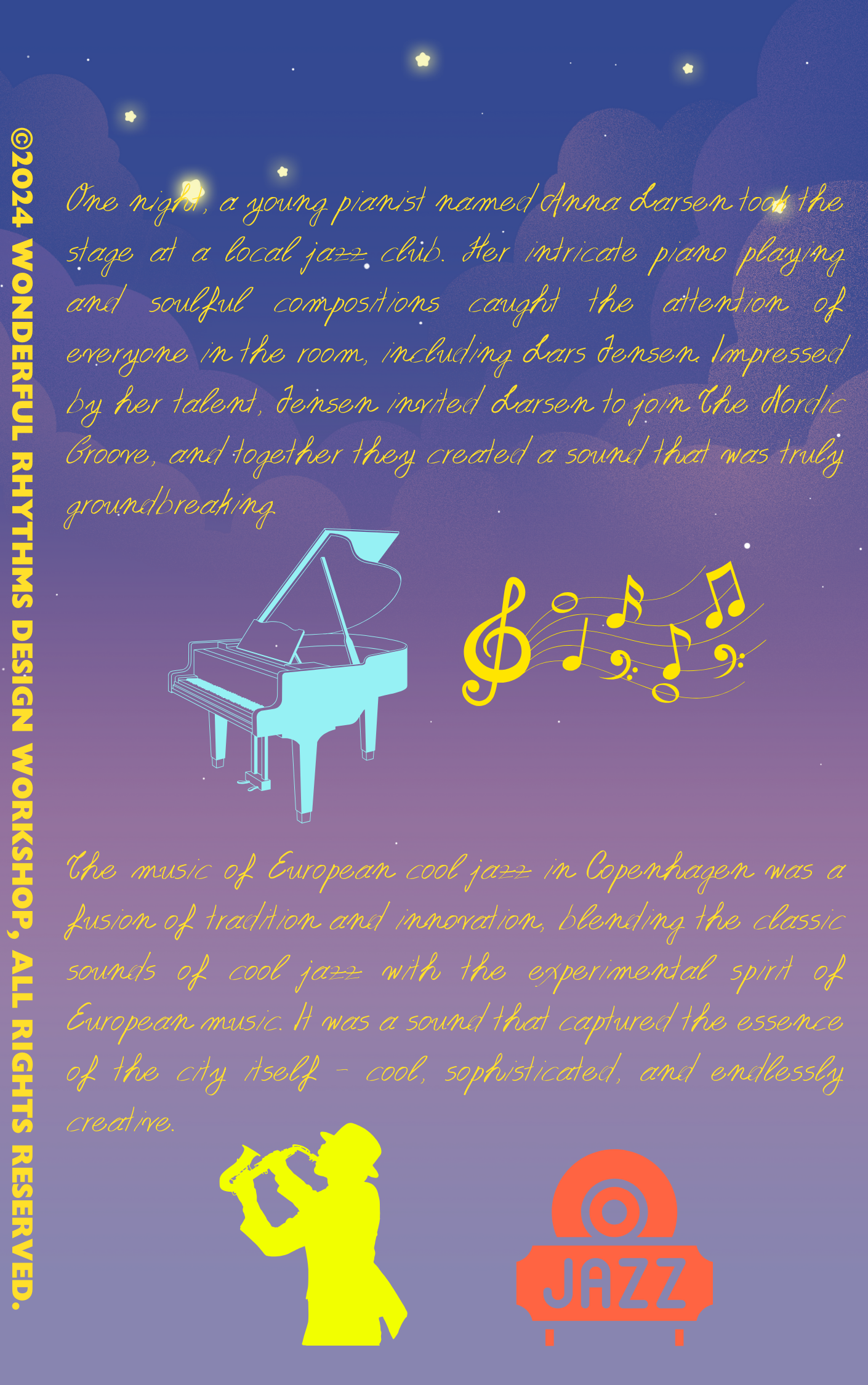 One night, a young pianist named Anna Larsen took the stage at a local jazz club. Her intricate piano playing and soulful compositions caught the attention of everyone in the room, including Lars Jensen. Impressed by her talent, Jensen invited Larsen to join The Nordic Groove, and together they created a sound that was truly groundbreaking.