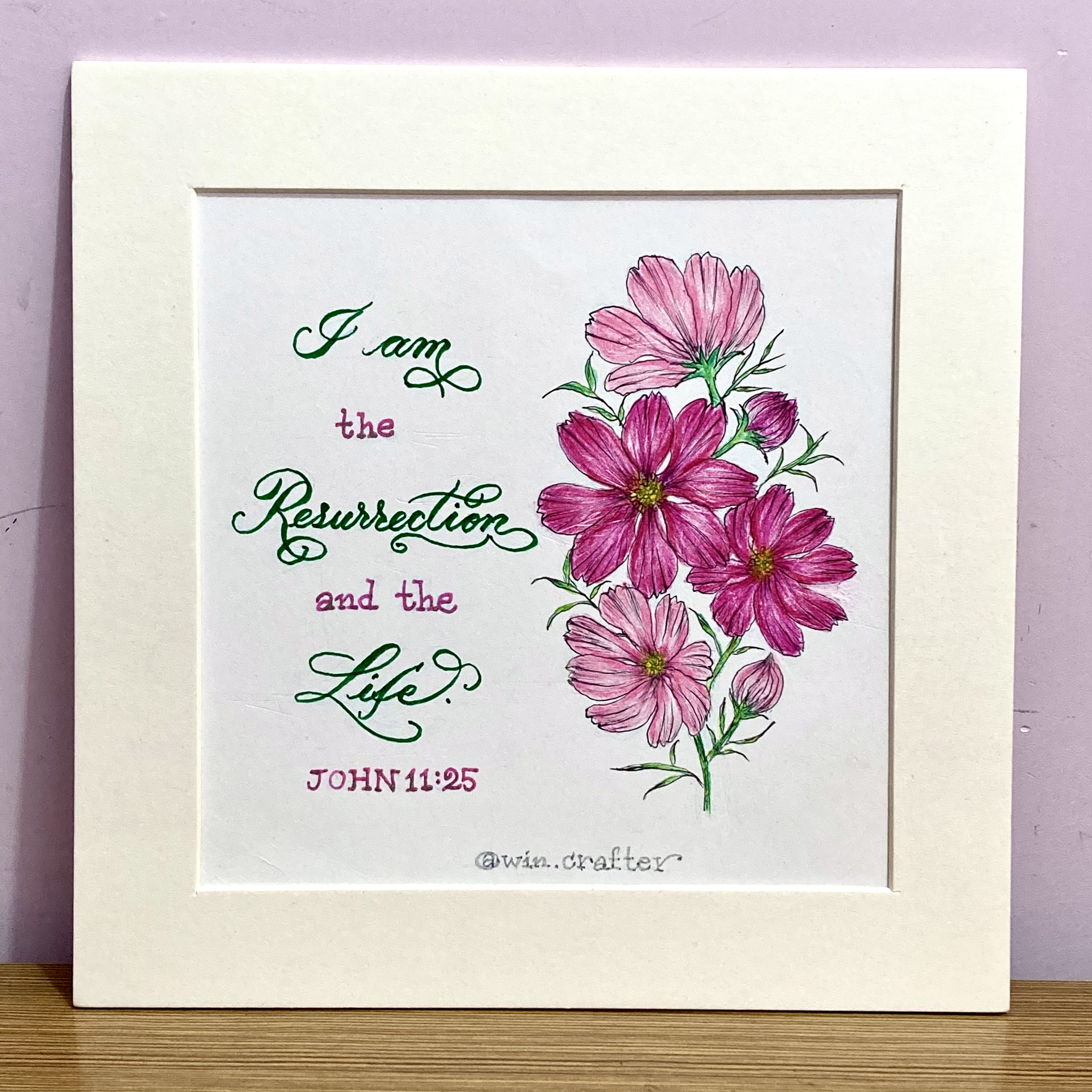 以西洋書法專用的 Brush Pen 書寫聖經金句,配上木顏色手繪的相關圖畫,大小尺寸為 15×15厘米,以紙畫框鑲嵌,無論是放在家裡勉勵自己,還是送給信主的親朋摯愛,都十分🈴️適!