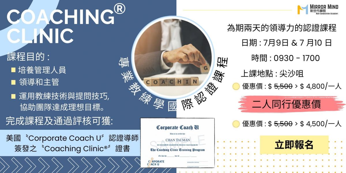 Coaching Clinic® 證書課程結合知識、技術及實用技巧,讓管理者懂得因應情況,高效運用並快速地看見成效。