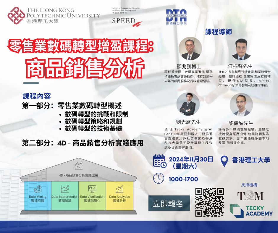而提升業績的關鍵就在於利用數據來幫助我們做出正確的決策,香港理工大學與DTA 攜手推出「零售業數碼轉型增盈課程:商品銷售分析」,專為零售行業設計。