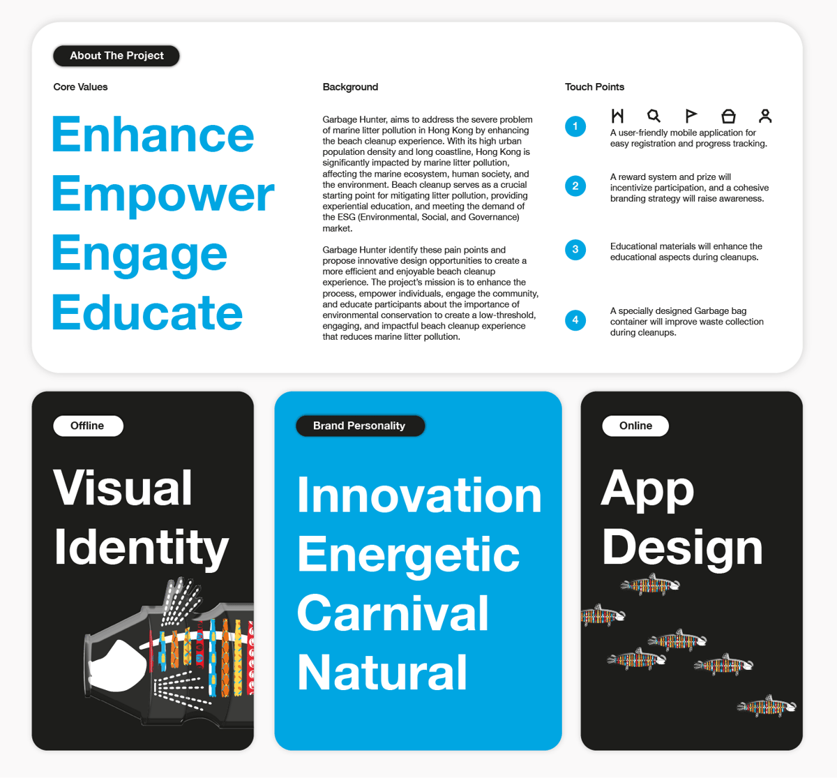 Garbage Hunter旨在透過提升海灘清潔體驗來解決香港的海洋垃圾污染問題。該項目包括行動應用程式、獎勵系統、品牌策略、教育材料和專門的垃圾袋容器。透過創造低門檻、愉快的清理體驗,垃圾獵人賦予個人權力,吸引社區參與,並為減少香港沿海地區的海洋垃圾污染做出貢獻。