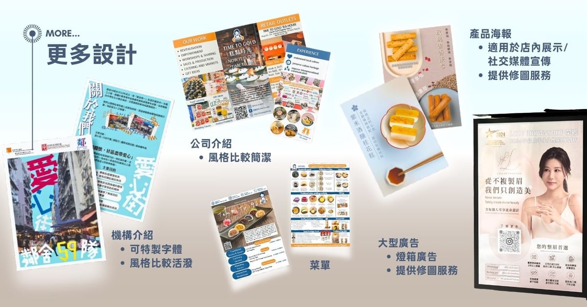 logo、卡片、宣傳單張、海報、餐牌、產品包裝、枱曆、貼紙、橫額、社交媒體廣告等等平面設計;