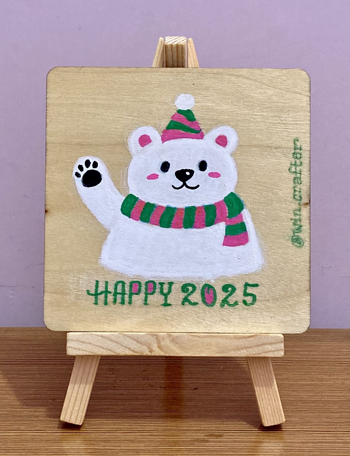 以麥克筆繪製於方形木片的可愛風小白熊,配上西洋書法手寫的新年祝福語句:「Happy 2025」,大小尺寸為 10 x 10 x 0.4厘米,不論是桌上作裝飾、杯墊、還是送給摯愛親友作為新一年的祝福,都非常合適。