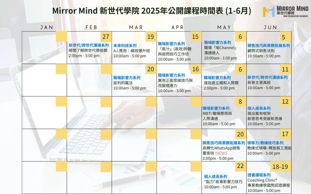 Mirror Mind新世代學院,專為年青新一代 (New-Gen)提供培訓及教練輔導,旨在幫助年青人展現潛能,讓他們邁向職涯高峰