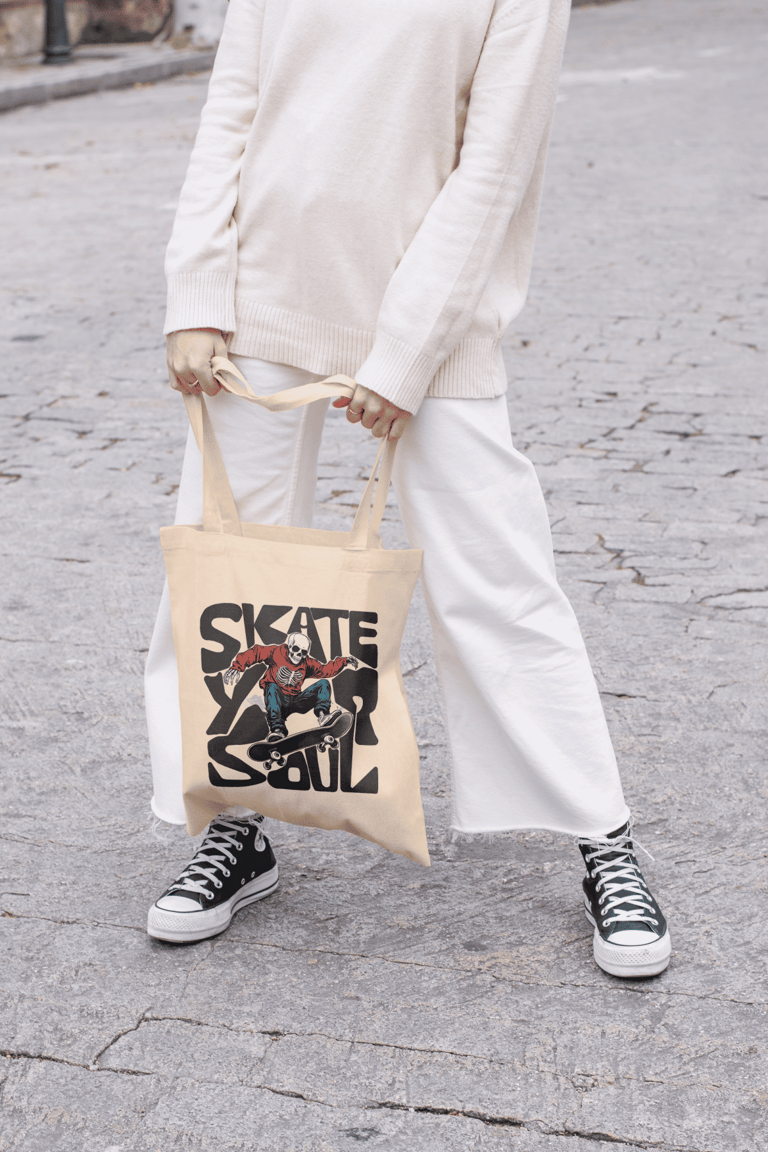 "Skate Your Soul" is a passion-driven project inspired by the vibrant skateboarding culture, combining creative storytelling and design to represent the free-spirited and fearless lifestyle of skateboarders. The design features a skeleton riding a skateboard with a relaxed flow, symbolizing the idea of skating not just as a sport but as an expression of individuality and freedom. This project aims to bridge the gap between art and skate culture, offering functional yet meaningful designs, like tote bags and apparel, for everyday use.