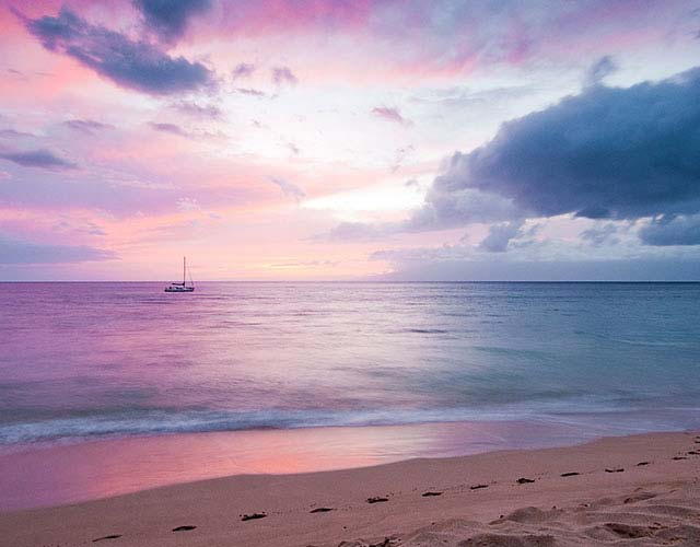 沙滩上人影寥寥。一个孩子正俯身专注地拾捡贝壳,小小的身影被夕光拉得长长的,投在金色的沙子上;不远处一对情侣并肩而坐,肩头相抵,无声地凝望远处,海风偶尔撩起他们的发梢,世界仿佛静止在两人之间。唯有阳光在移动,渐渐从明黄转为柔和的橘红,将天边几缕薄云染成羞涩的绯红,又为海面镀上跳跃的、流动的碎金。沙滩上的细沙也在光中变幻着容颜,从耀眼的白金渐次沉入温暖的琥珀色调。